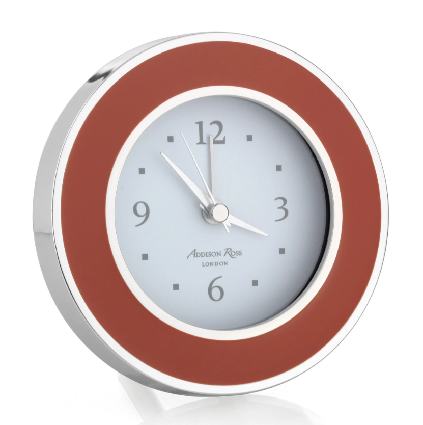 Our orange enamel alarm clock beautifully complements our enamel frames, complete with an alarm function, this clock is ideal for a bedside table or desk. Backed in luxury grey velvet with a silver clock movement cover.