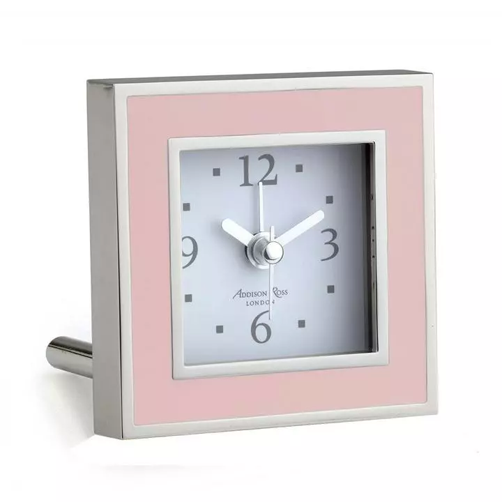 Our pink enamel alarm clock, complete with an alarm function, is ideal for a bedside table or desk. Backed in black velvet with a silver clock movement cover.