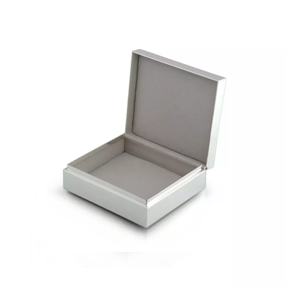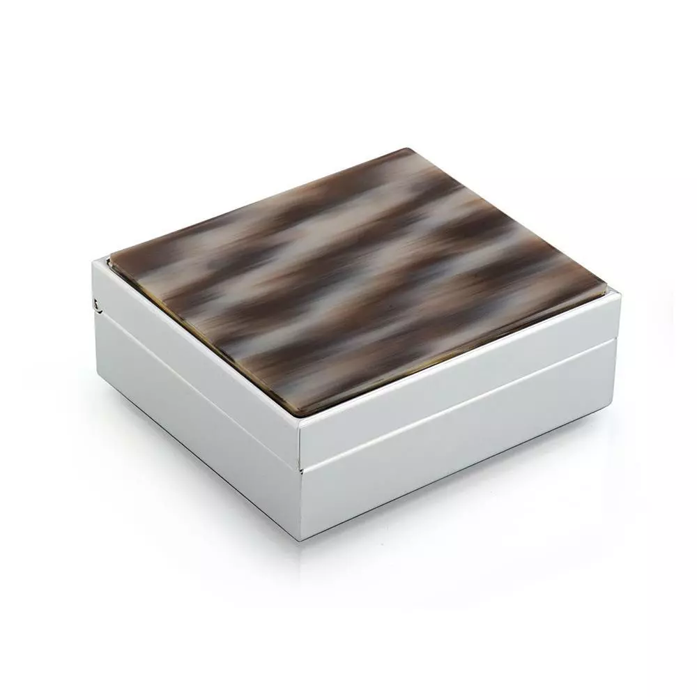 Beautifully finished, our polished faux grey horn box is finished in silver plate. This versatile hinged trinket box is lined with rich black velvet both inside and beneath the base. A perfect size for jewelry, cuff links or desk top bits and pieces.