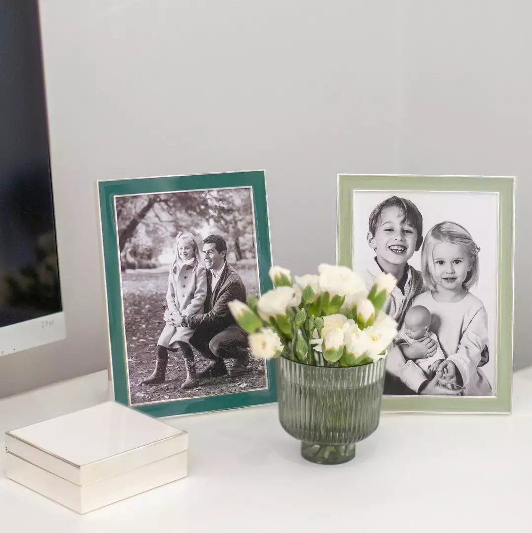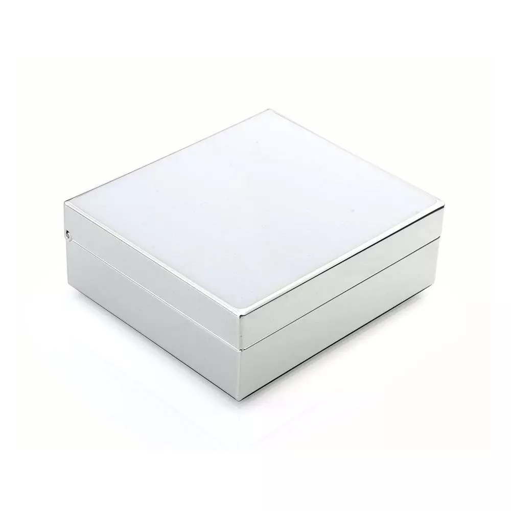 Beautifully finished this White Enamel hinged box is finished with silver plate and lined with dove grey velvet. A perfect size for jewellery, cuff links or desk top bits and pieces.