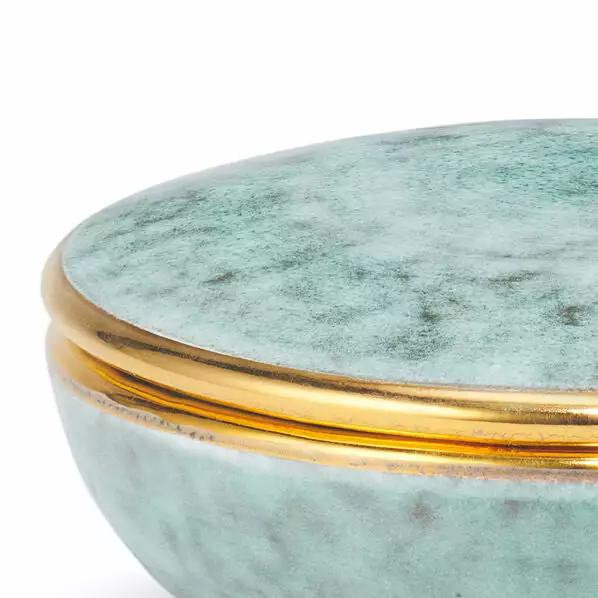 This hand-thrown box and lid has been enhanced using a glazing technique that provides a textured, natural appearance, giving it an overall artisanal appeal. Elevated by hand-painted gold detailing, it is a versatile piece that keeps personal items organized on a desk or vanity.