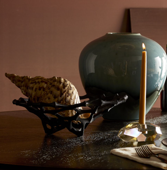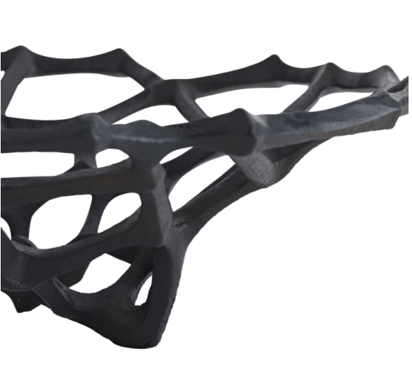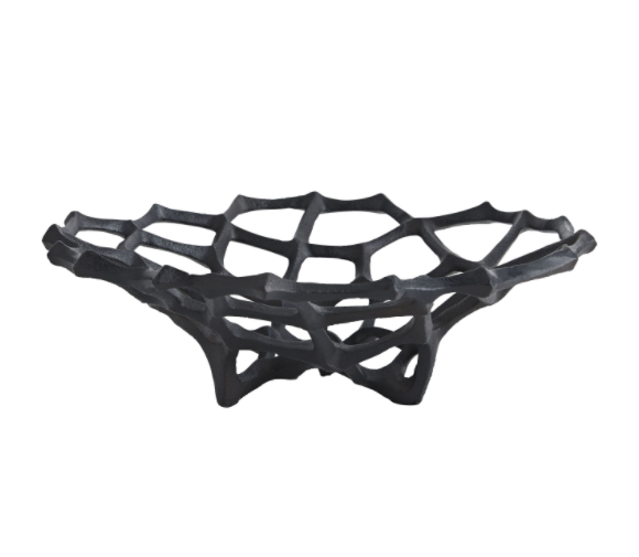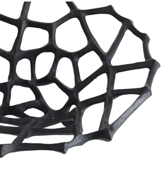 The cast aluminum web-like pattern is finished in antique bronze. Definitely organically inspired. Stands alone as a sculpture or can be filled with simple decorative objects by your choice.