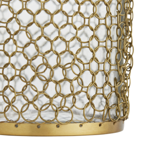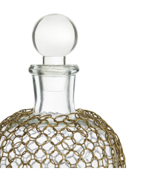 An exquisite clear glass decanter features an understated silhouette, the overall design is elevated by a delicate, antique brass chainmail mesh overlay. Slightly medieval, the design is timeless and food safe so fill with your favorite libation and add to the collection of decanters on your bar.