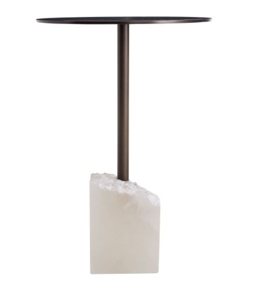 A mix of rich materials gives tons of character to the Jane Accent Table. A round bronze steel top and matching post are embedded into a rough hewn white alabaster base. Truly rugged and refined, this petite table balances a cocktail just within reach. Marble will vary.