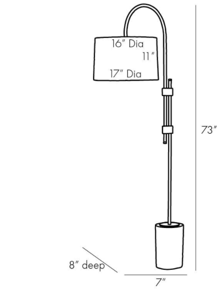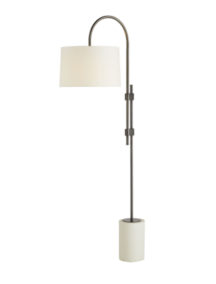 The Ily Floor Lamp has a contemporary design with classic sensibility. An english bronze steel foundation showcases an overscale arch, which presents an off-white linen shade with off-white cotton lining. Bracket details join the two-part frame for an architectural and unexpected modern touch. Effortlessly exhibited on an oval faux-marble resin base for an ultra-luxe appeal. Complete with a taupe cloth cord.