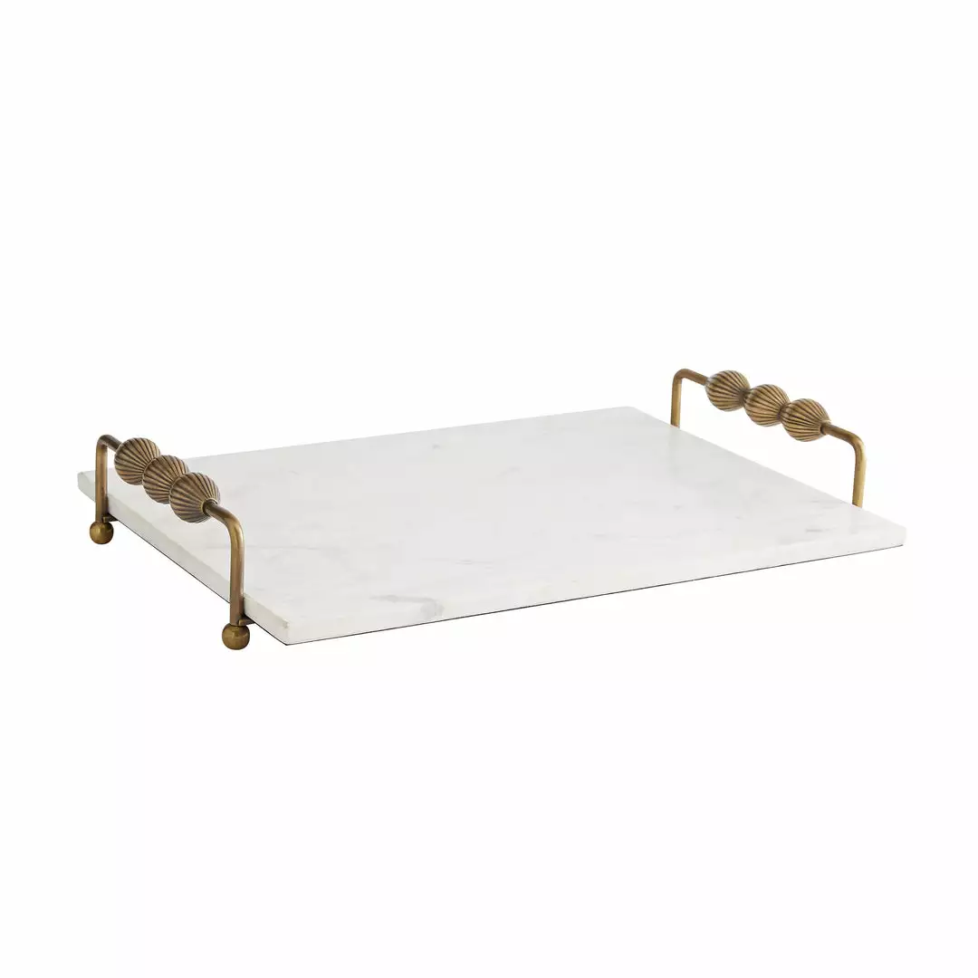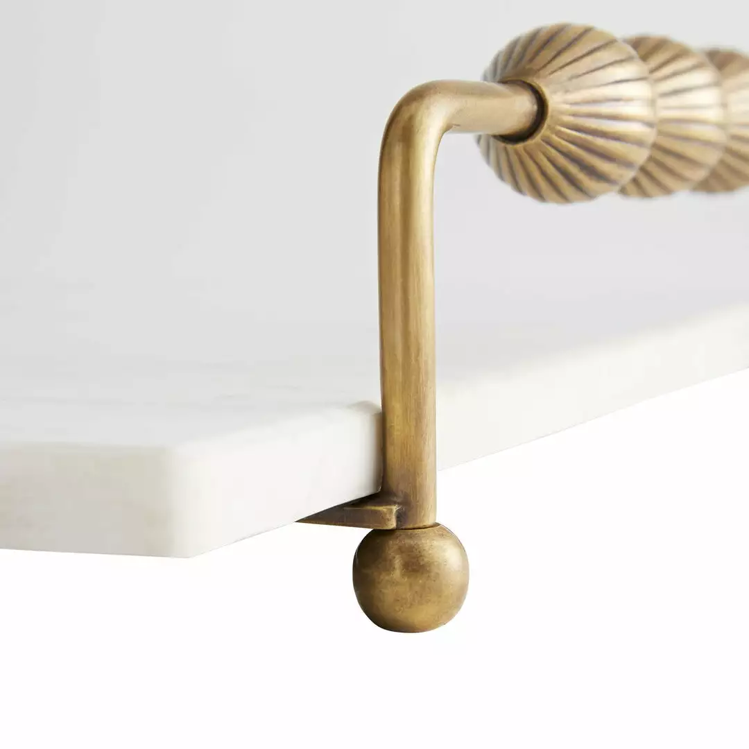 Take your serving style to the next level with the Eileen. Whether you fancy hors d’oeuvres or charcuterie a white marble platform sets the stage for upscale serving. Antique brass bauble accents embellish the handles adding a feminine touch to its sleek yet straightforward form. Food safe.