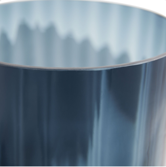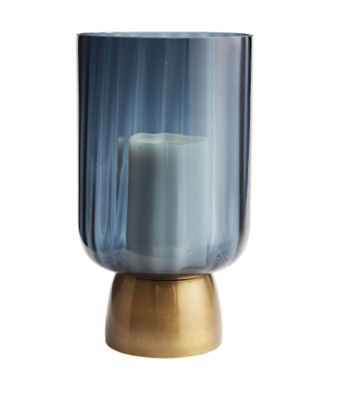 The Ingram is pure elegance, as a hurricane or vase. Optic glass finished in navy blue meets an antique brass base, creating a simple yet striking contrast. Its straightforward silhouette is ideal for a 3-inch pillar candle—let the flicker of a flame accentuate its form. Watertight. Finish will vary.