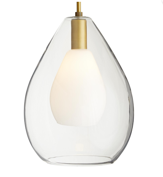 Two shades of hand-blown glass forms the drop of this pendant. Seemingly simple in its design, an inner teardrop-shaped shade conceals a standard bulb in opal glass, then a larger shade rests outside it, exposing the inner piece in clear glass. Both hang from a stainless steel stem and mount, both finished in antique brass. Damp-rated, although limited covered outdoor conditions may affect finish.