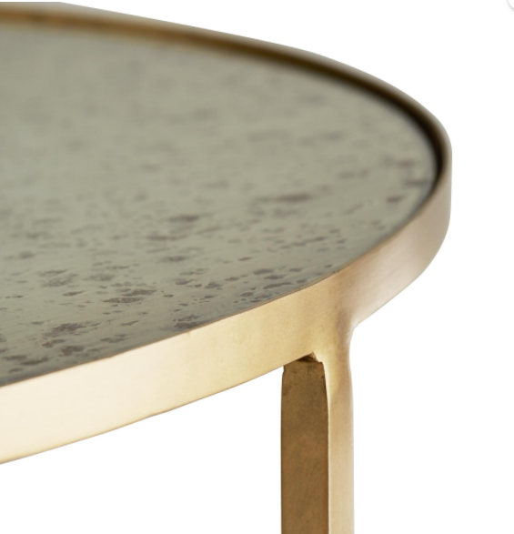 Round 3-tiered iron Side Table in an antique brass finish with inlaid antique mirrored top and shelves.