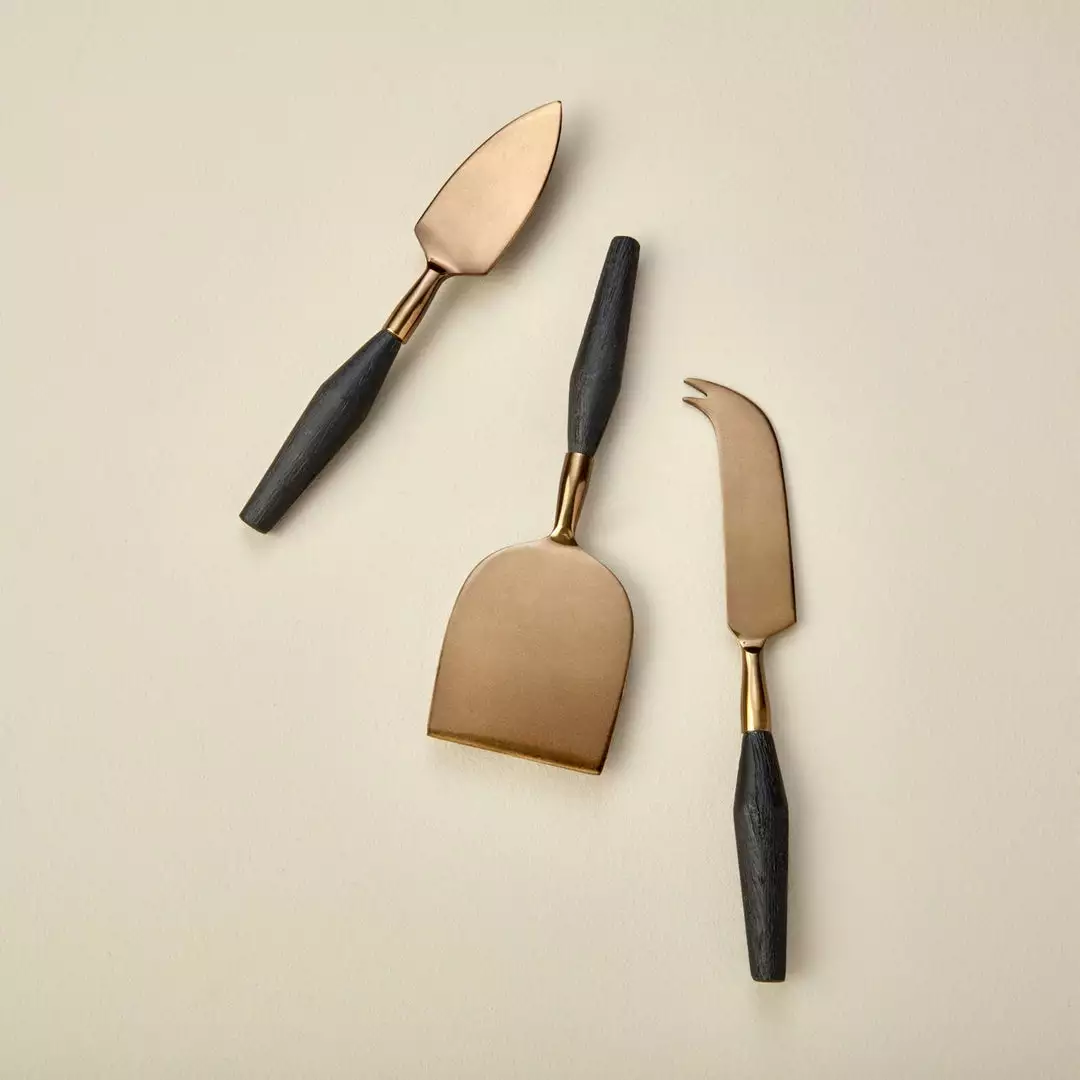 With our Arendal Cheese Knives, a bit of contrast goes a long way making them a bold addition to any table. Handcrafted from protected groves in India, this dreamy trio boasts a darkened color palette, beautifully accenting its natural striations and subtle highlights.