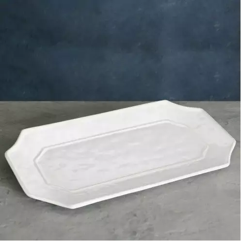 Charleston! Think elegantly simple classic forms in luxury melamine, distilled to the essential, enhanced with rich and lively surfaces with the look of fine ceramics. Charleston White Long Rectangular Platter is a handsome, multifunctional piece featuring a textured surface, notched corners, and a gently raised border for casual décor and entertaining.