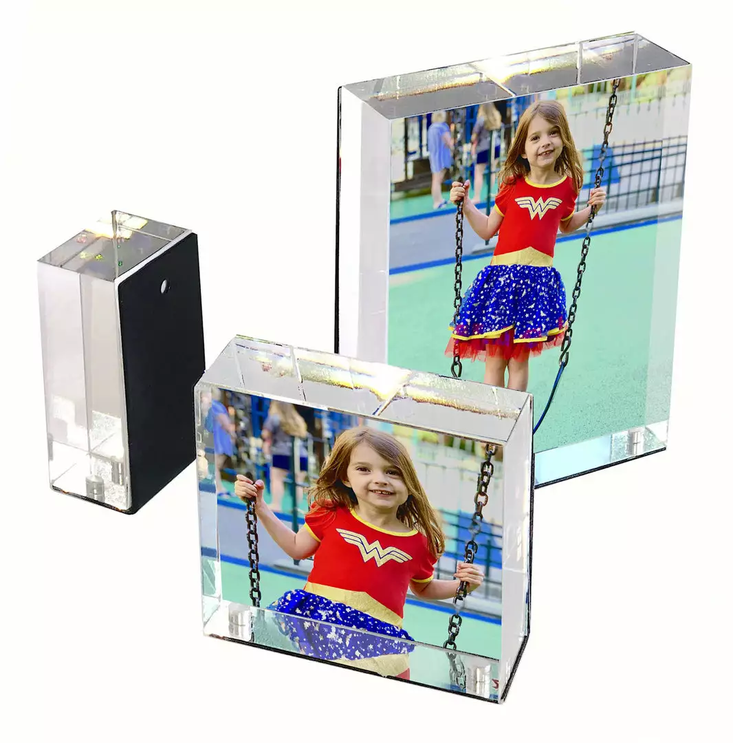 These mini frames are perfect for small spaces and are great accents for any décor. A solid clear acrylic block is held by barely visible magnets to an L-shaped metal holder. Your image is displayed without obstruction.