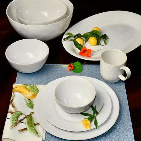 All pieces are durable stoneware that is dishwasher and microwave safe.