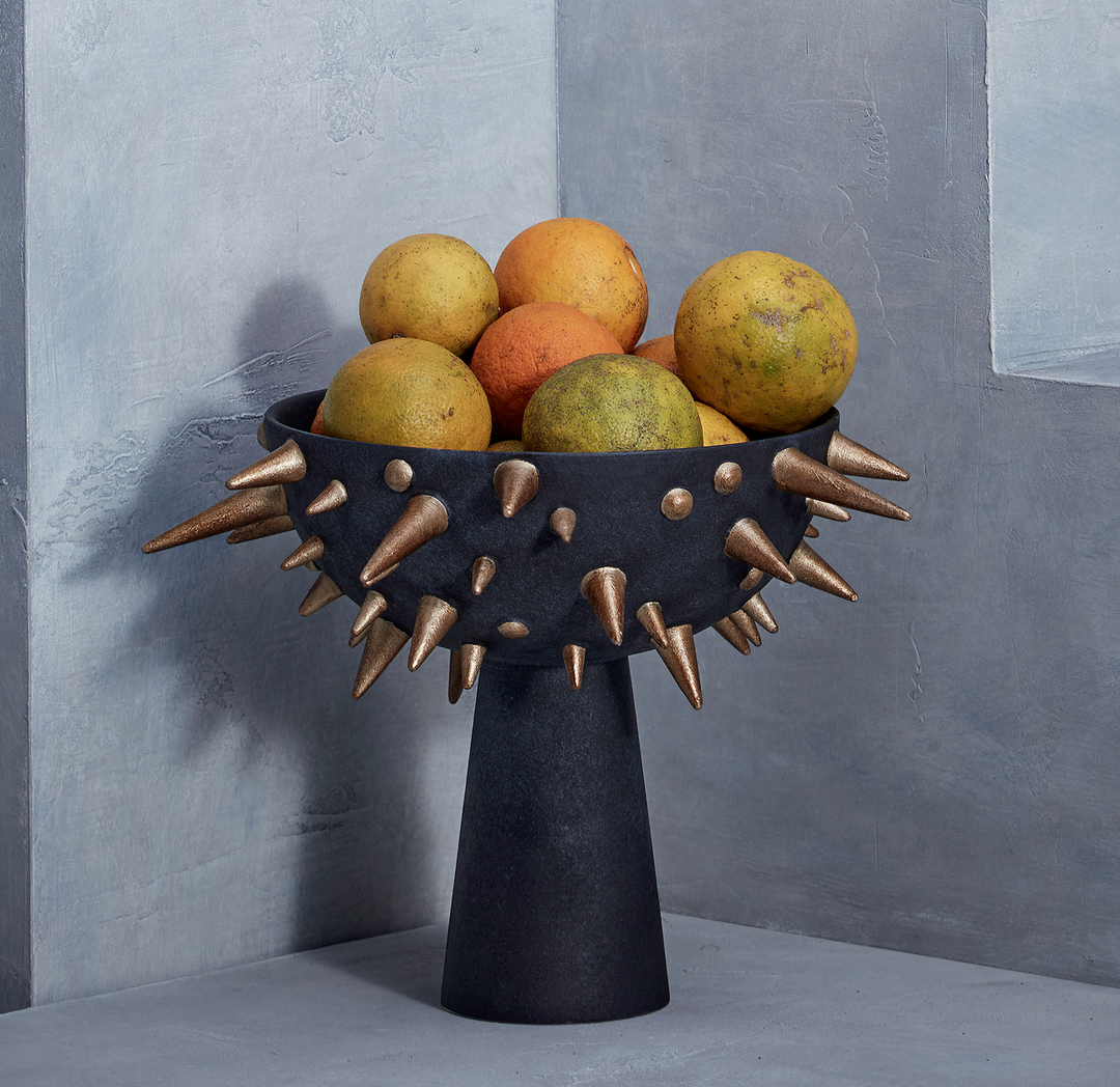 Evoking primitive artwork reimagined for a modern aesthetic, the Celestial collection combines earthenware with hand-painted, textural details to create a uniquely radiant design statement. The collection includes footed bowls, mirrors, and hanging lamps with antiqued brass hardware.