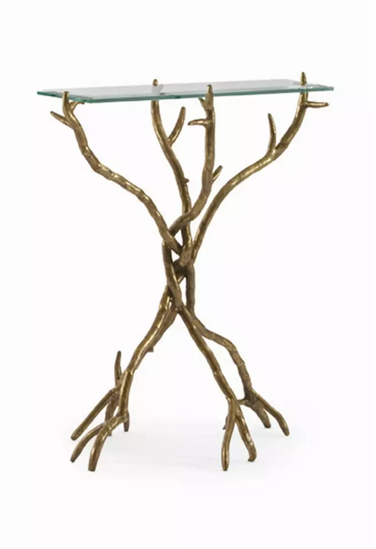 This chairside table is a whimsical form reminicent of a bundle of branches hand worked in wrought iron then electroformed in brass. The branches come together in the center then open up to capture the 1/2″ thick with 1″ beveled glass top. Truly a handmade work of art.