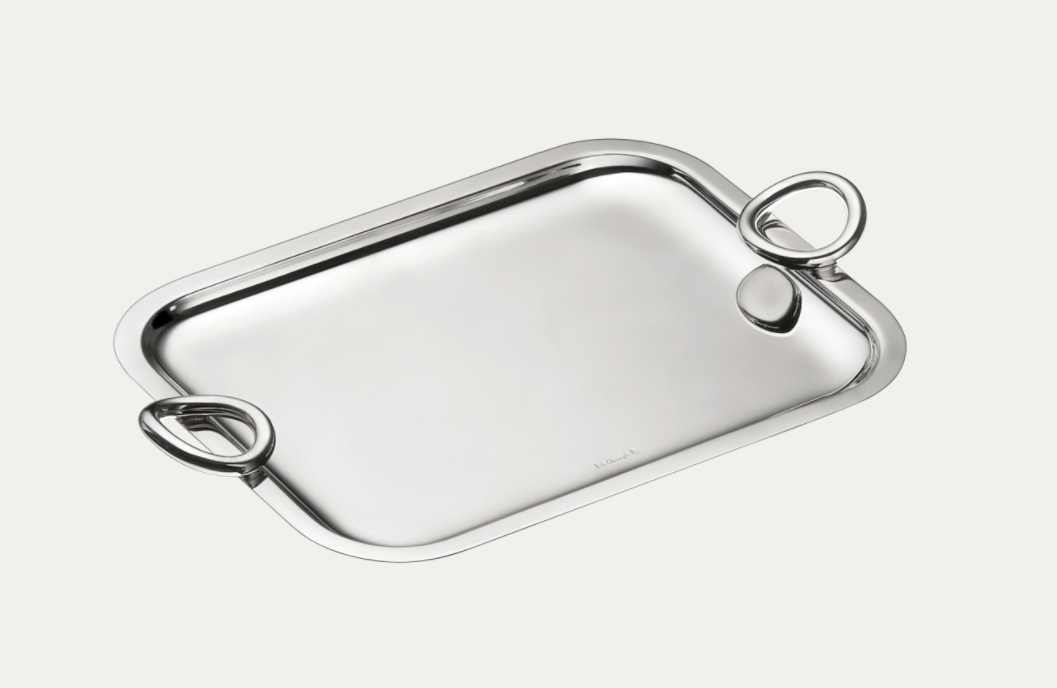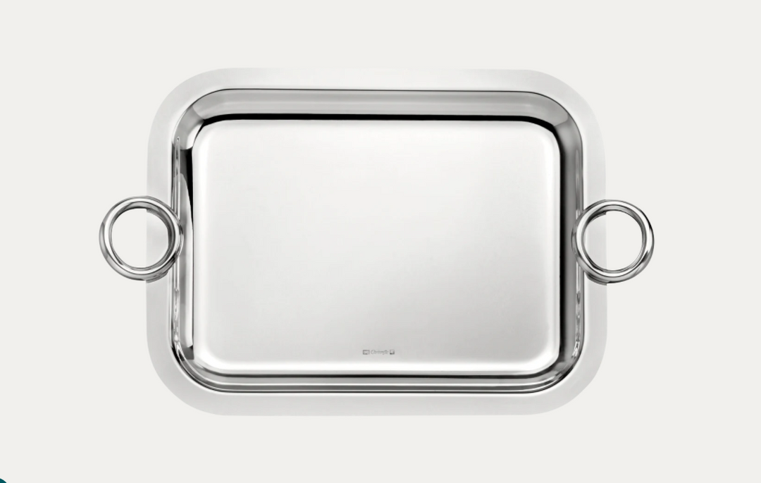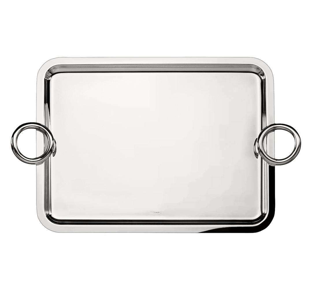 A silver-plated rectangular tray features two side handles.