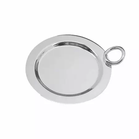 The silver plated coaster in the Vertigo pattern is designed to hold wine and water bottles as well as carafes and protect the table from condensation rings. Vertigo’s bold motif — a subtly asymmetrical, thick ring often placed playfully askew — can be found on every piece in the collection designed by Andrée Putman.