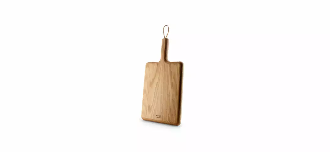 Fantastic Wood Cutting Board presents the wood surface with practical leather handle.