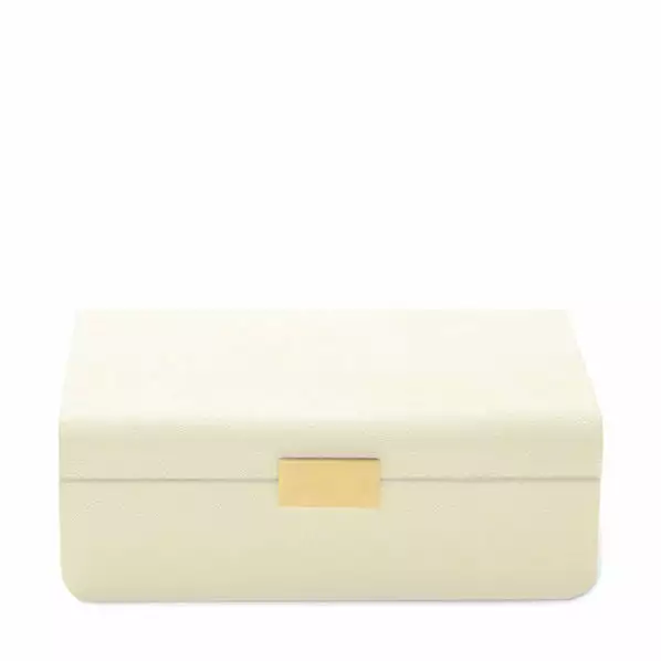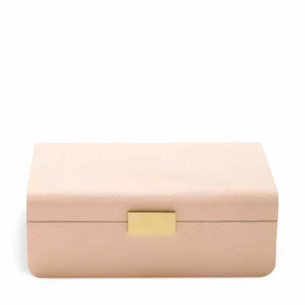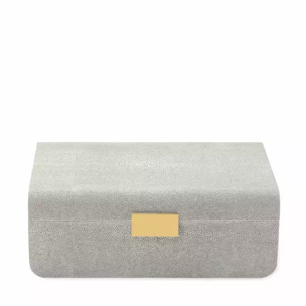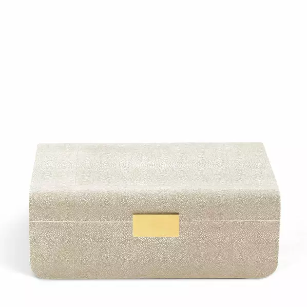 This decorative box is finished with a textured, embossed shagreen. Its curved lines have a sculptural appeal, while brass detailing adds a stylish touch. Use it for jewelry on a vanity or to organize personal objects on a desk or table.