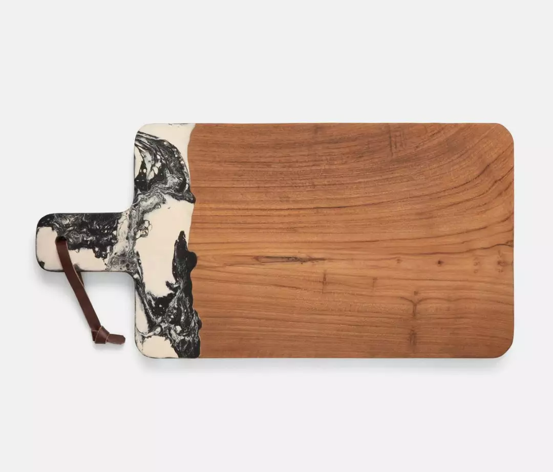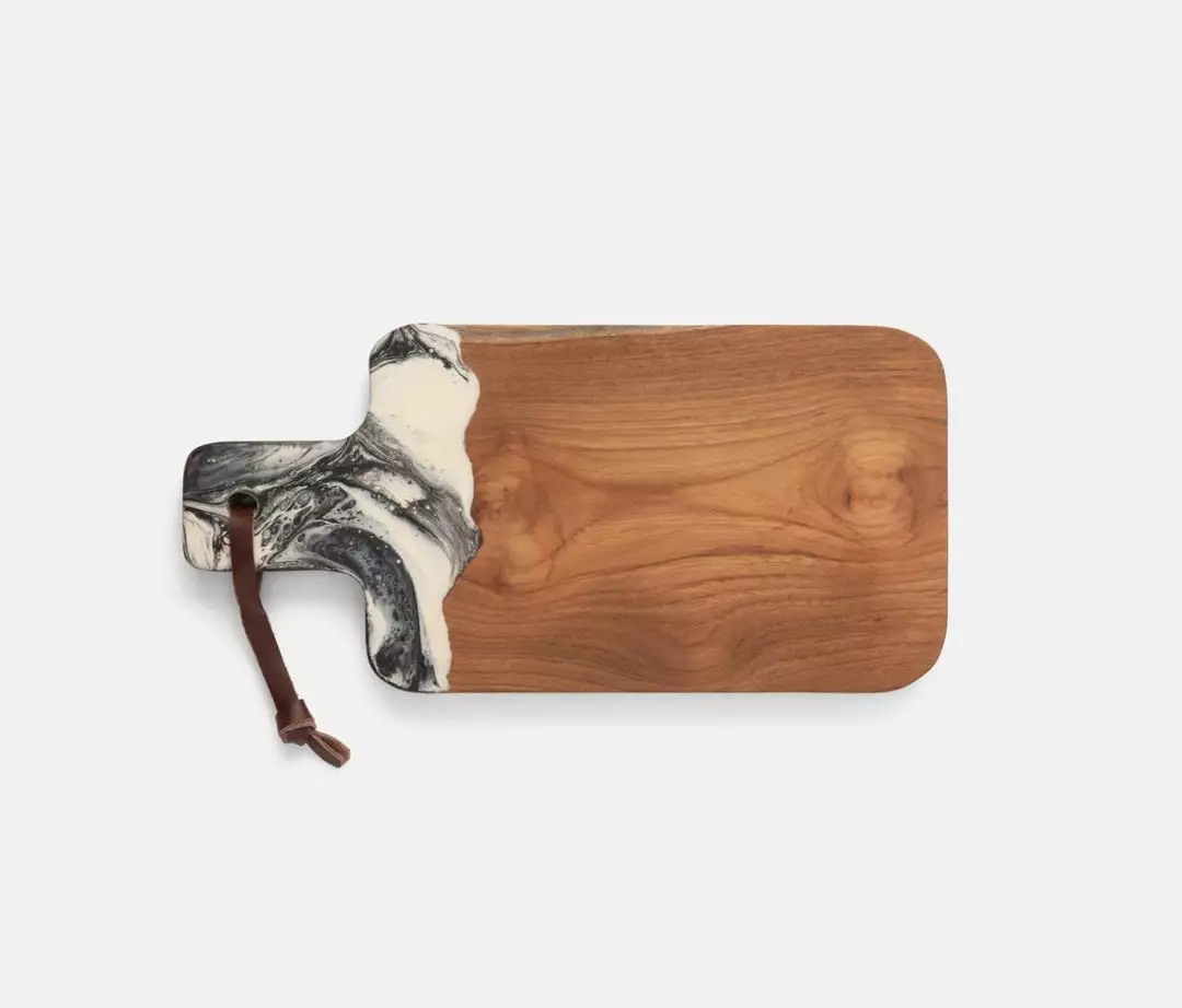Teak and resin, two materials handcrafted together, bring a splash of color to any setting. Available in unique hand-dipped colors and two sizes, no two cutting boards are exactly alike. Finished with a leather strap.