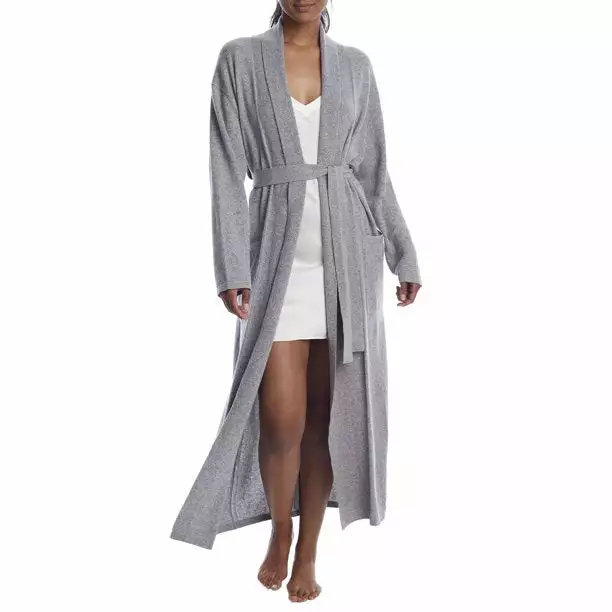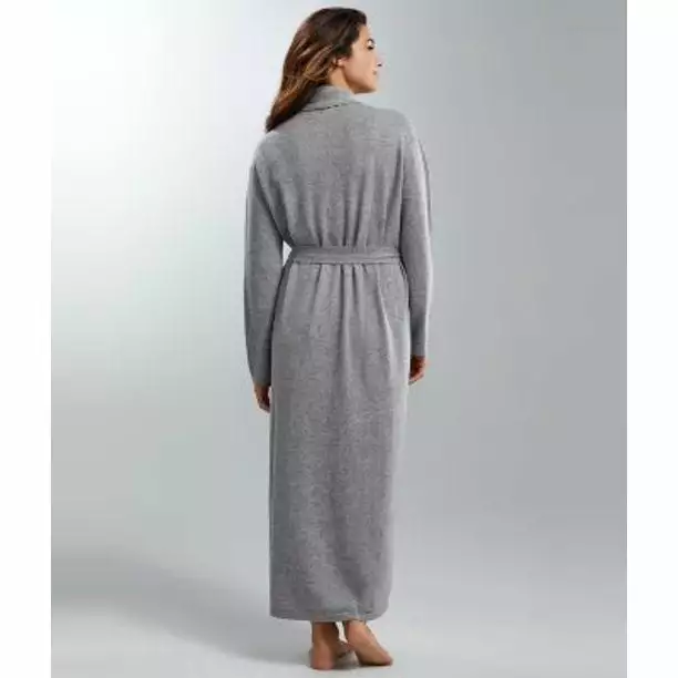 100% Cashmere, shawl collar, wrap waist with a belt, two side patch pockets.