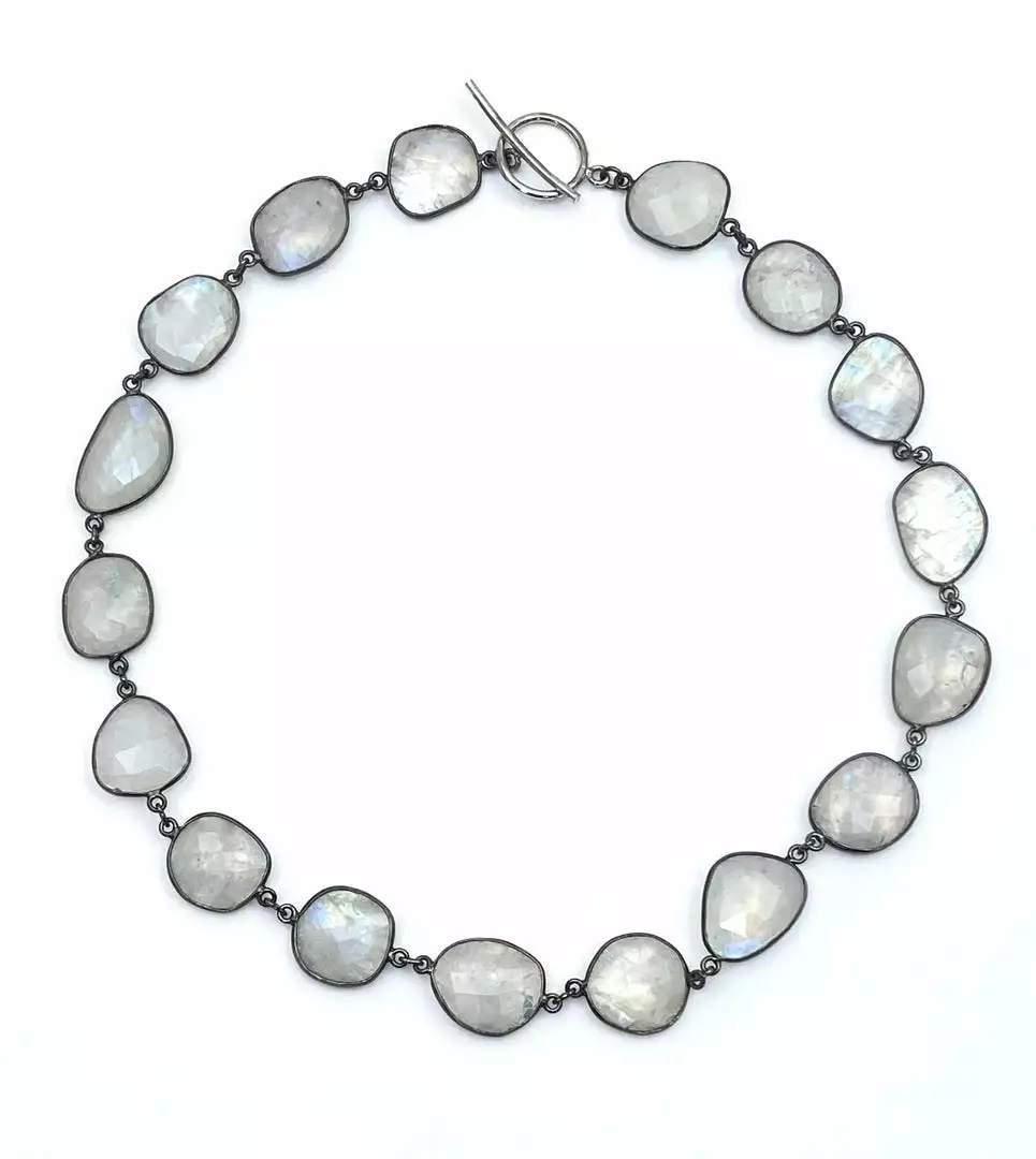 Large faceted moonstones set in oxidized metal and sterling silver toggle clasp.