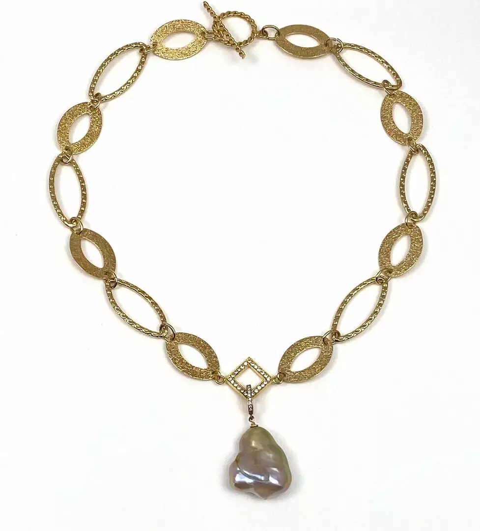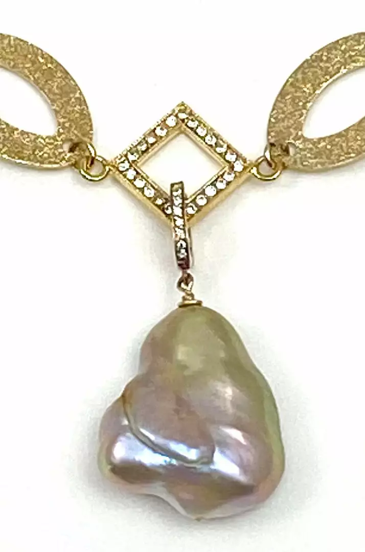 Lovely open links of 14k gold plated chain with a magnificent soufflé baroque pearl centerpiece, highlighted by a 14k gold plated and cubic zirconia component and removable enhancer. Two necklaces in one, a gold necklace and a gorgeous drop that can be worn on other pieces. 16 1/2”