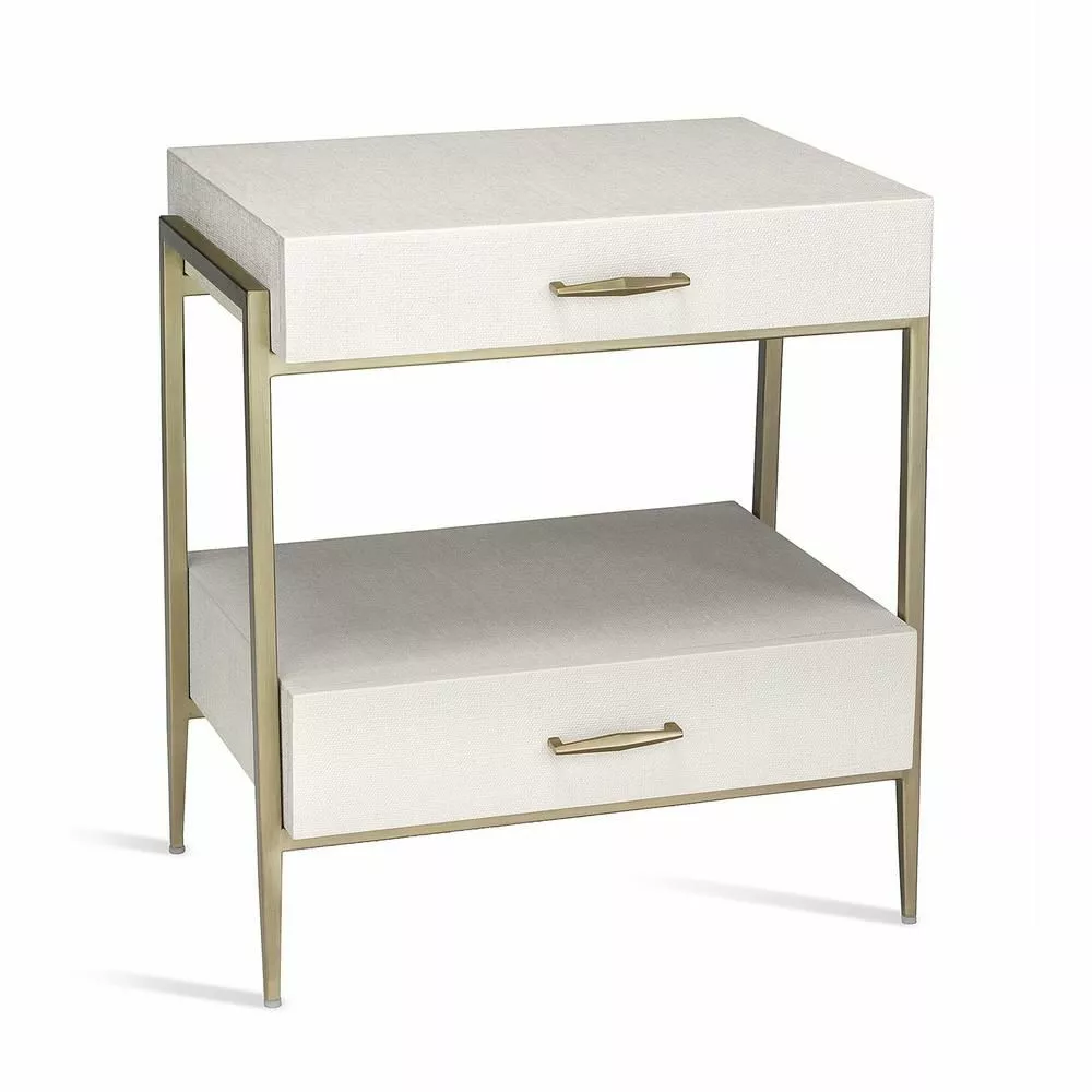 At once handsome and graceful, the Allegra Bedside Chest features a natural white faux linen surface and a metal frame in an champagne silver finish.