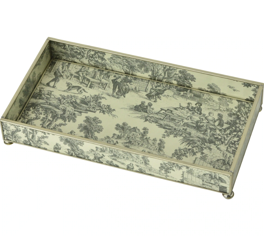 This sophisticated and elegant Black Toile tray is a perfect size for the bath vanity, as a catch all on a desk. A chic whimsical spin on stylish options for the well appointed home. Each piece of is soldered by hand and crafted of either metal trimmed mirror or glass with dynamic colors and various patterns.