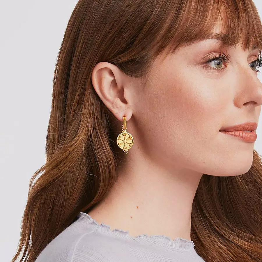 Raised bead hoop with reversible charm—a compass-inspired carving on one side and a luminous mother of pearl on the reverse.