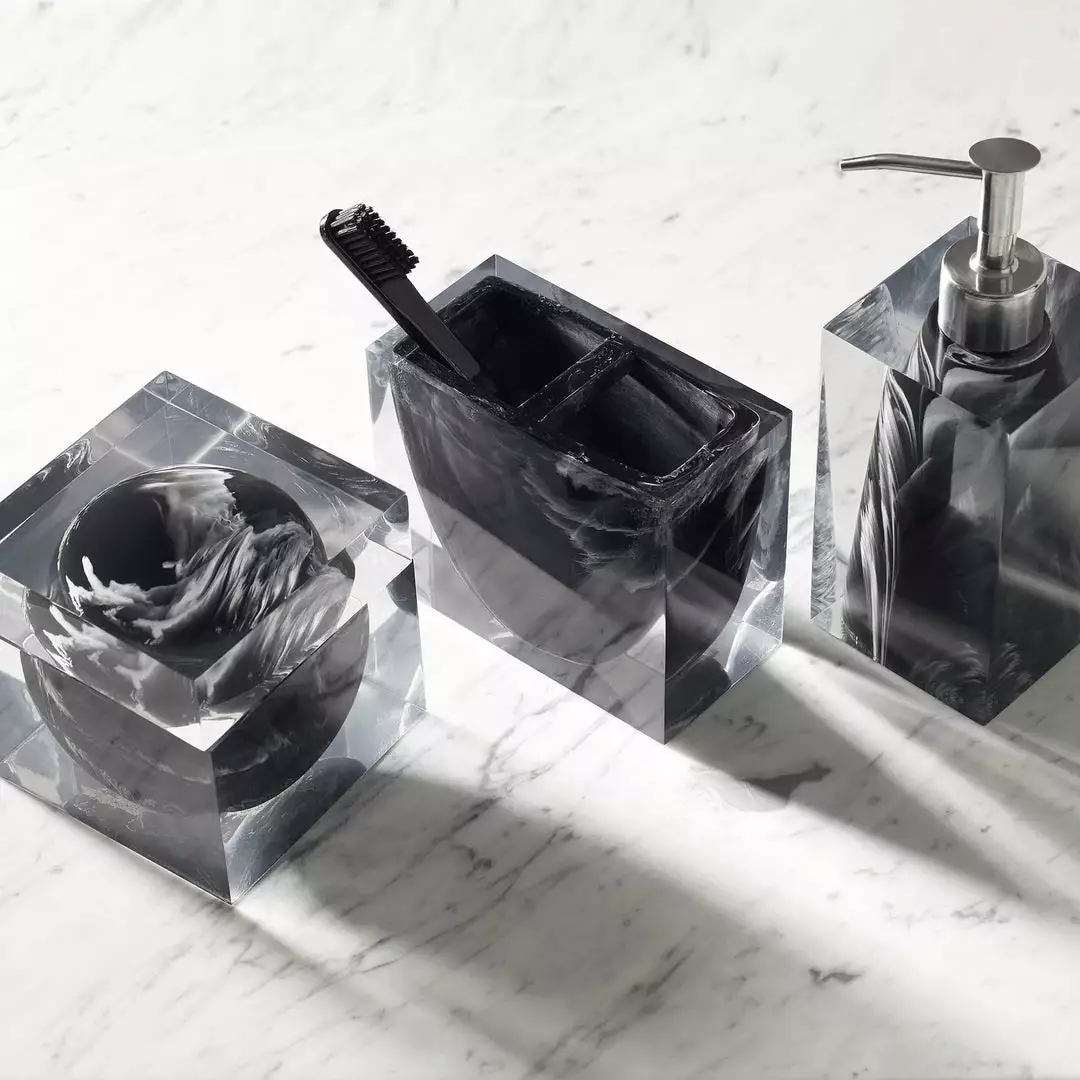 Adorn your spa with these bath accessories. Crafted with ink-injected resin that floats seamlessly in a translucent acrylic encasing, these accessories complete a bathroom that radiates with textural and modern appeal.