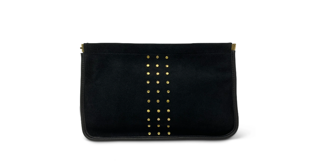 You’ll be chic and cool when you keep this stud suede clutch close at hand! Stash all that you need when you’re keeping it simple and you’ll be ready in a simply all too satisfying snap!