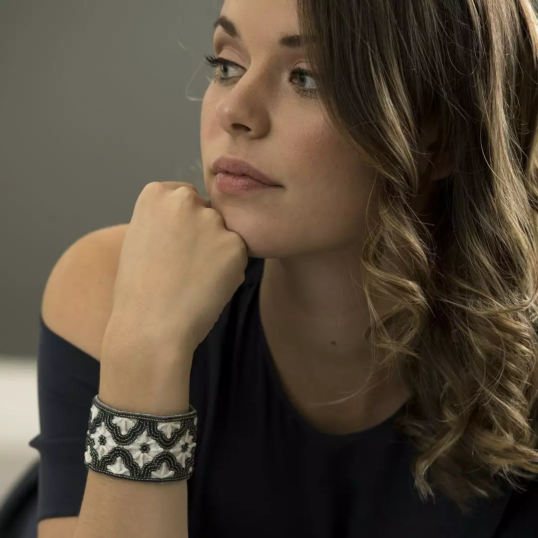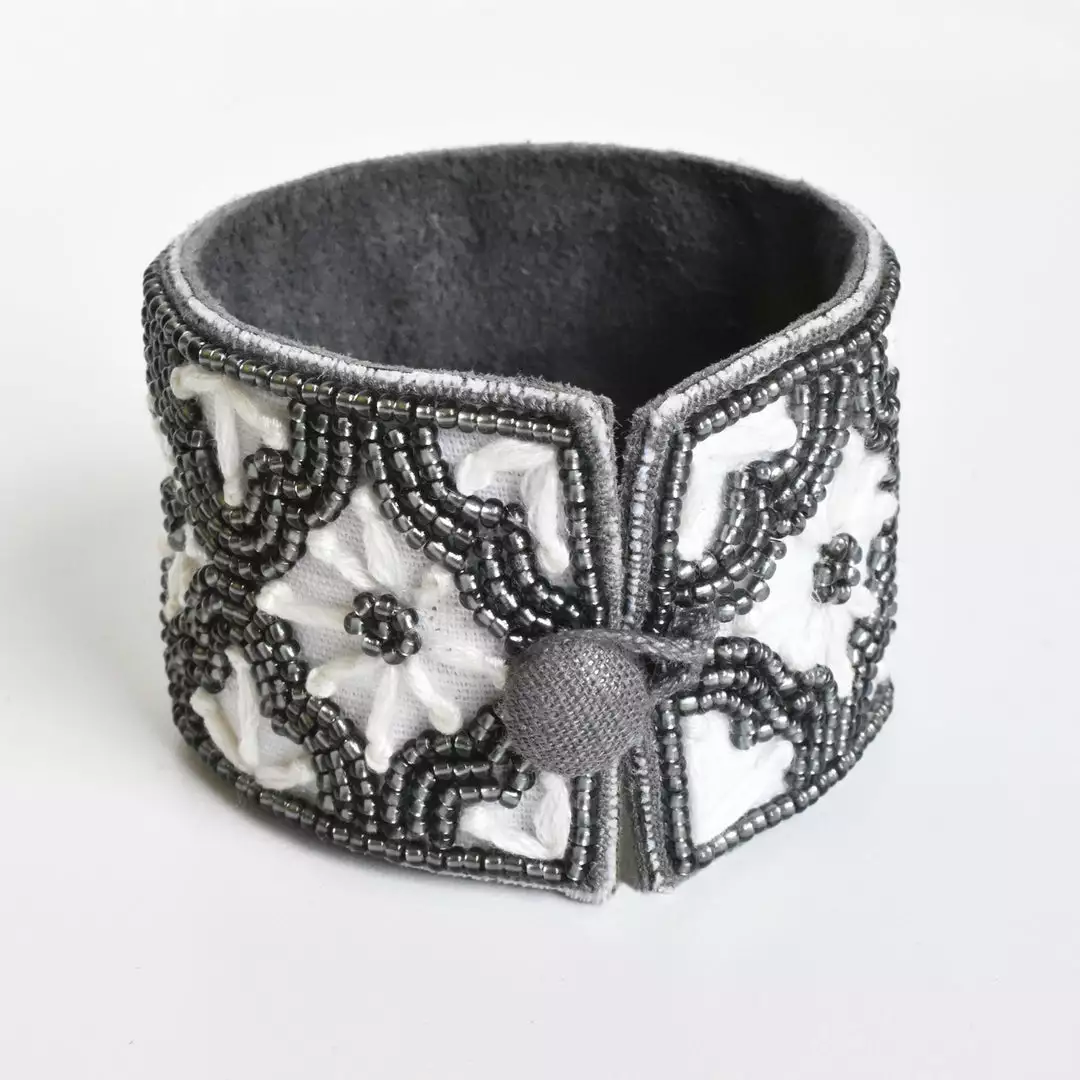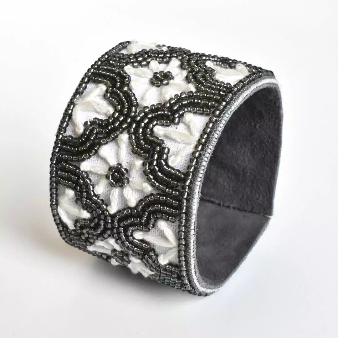 Flowering out of a bed of beads and embroidery threads, this elegant cuff bracelet combines geometry and organic sensations. Layered upon suede and cloth, neat rows of metallic beads outline flowers of french knots.