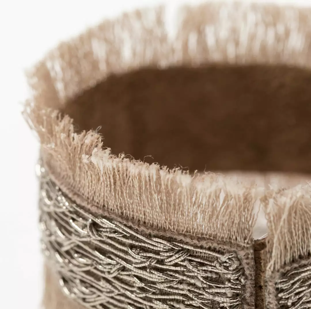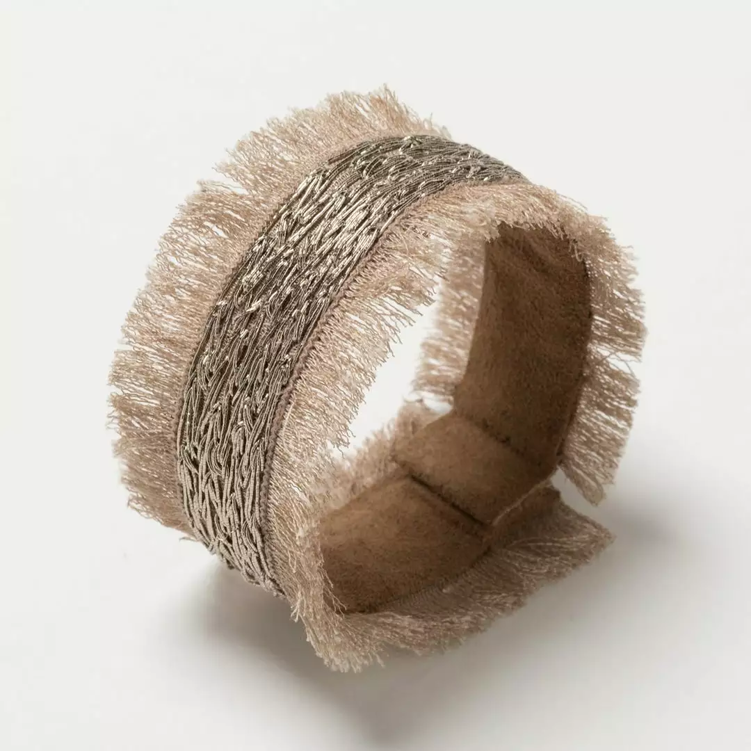 A casual and unique bracelet, freely stitched metallic thread is couch stitched on a cloth with exposed fringe over a base of soft suede. This cuff comes in two lengths and is smoothly sealed with an invisible magnet.