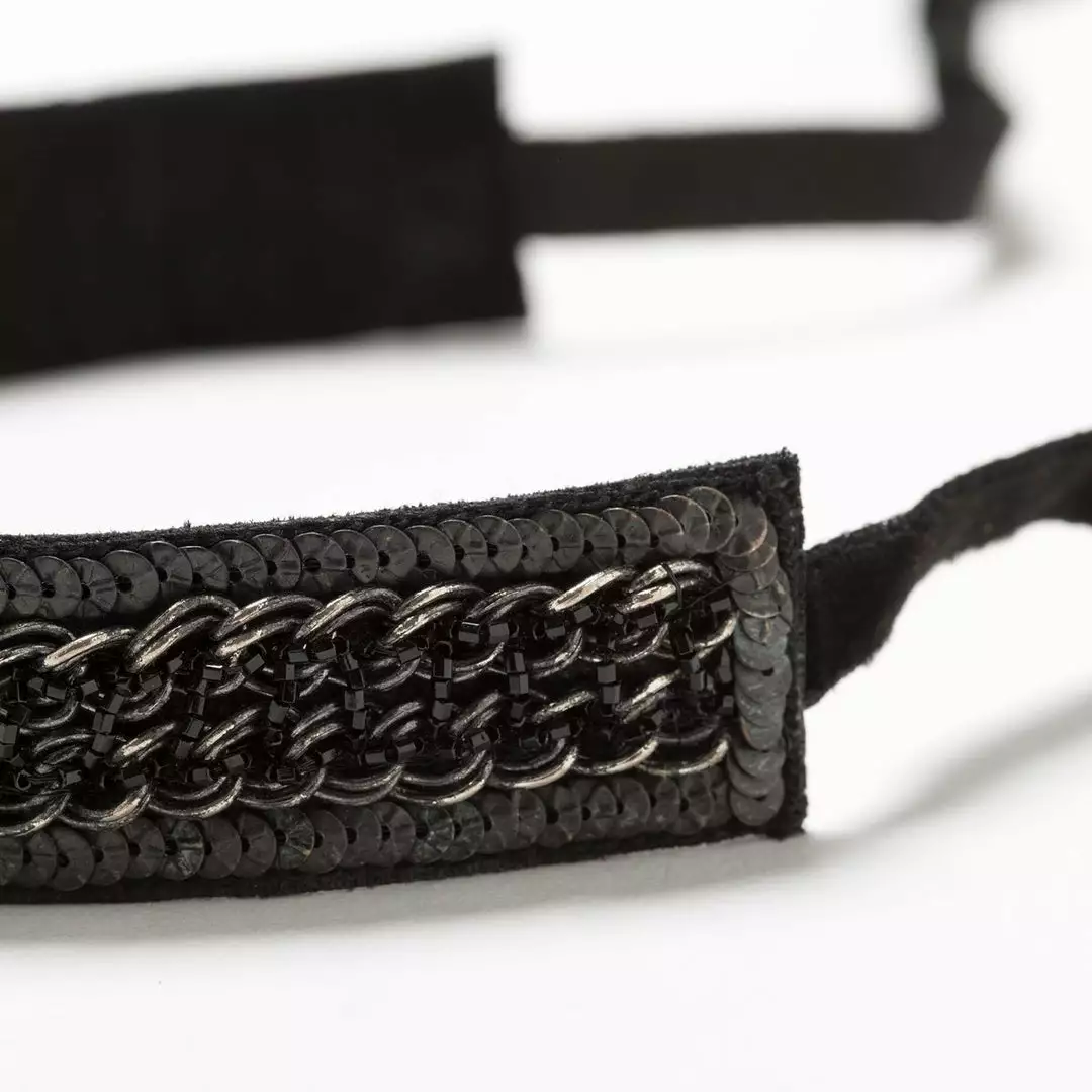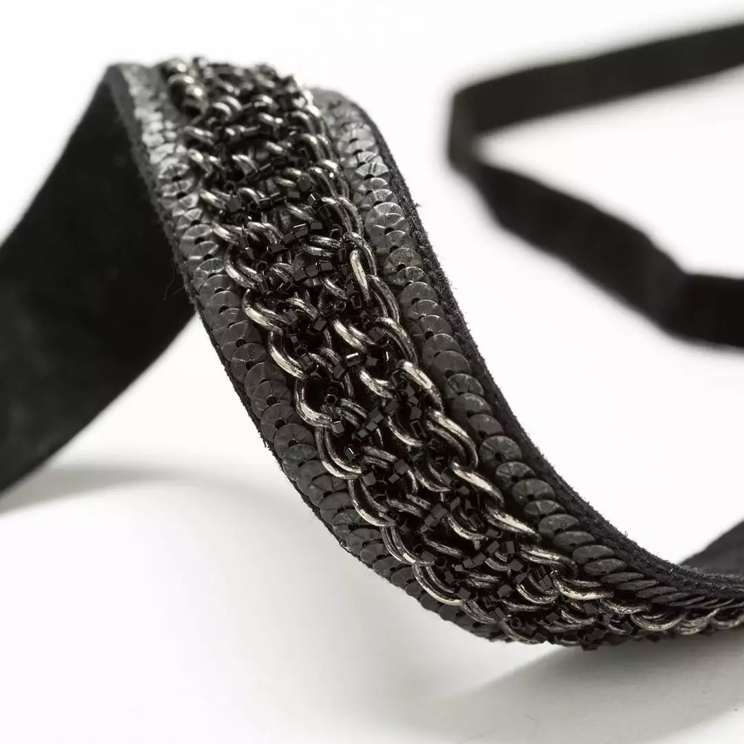 This elegant choker combines chain, sequins and beads in a structured, intricate surface. Backed with soft suede, and velvet ribbons extend for easy fastening.