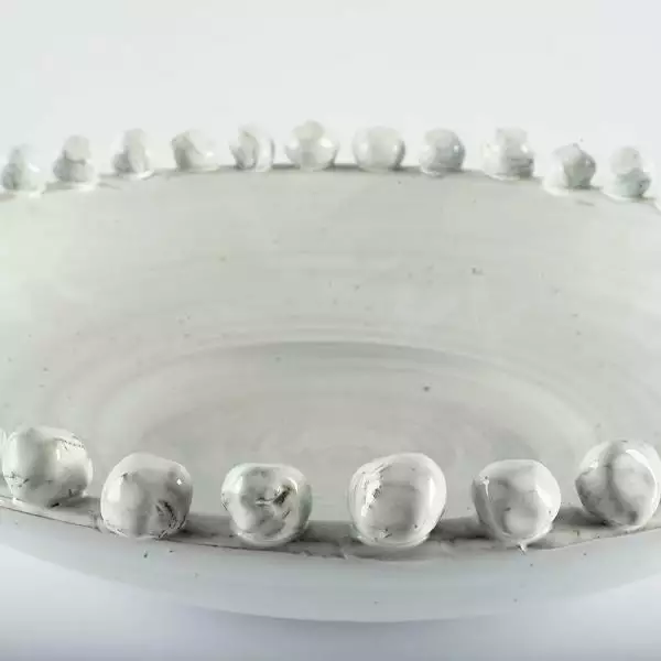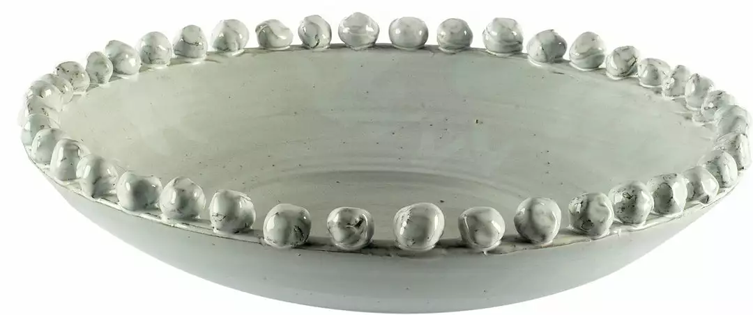 This is a low profile ceramic bowl that is great as a decor item or can be functional and hold, keys, fruit or anything you can think of really. It has a off white finish with hand made ball accents circling the top rim.