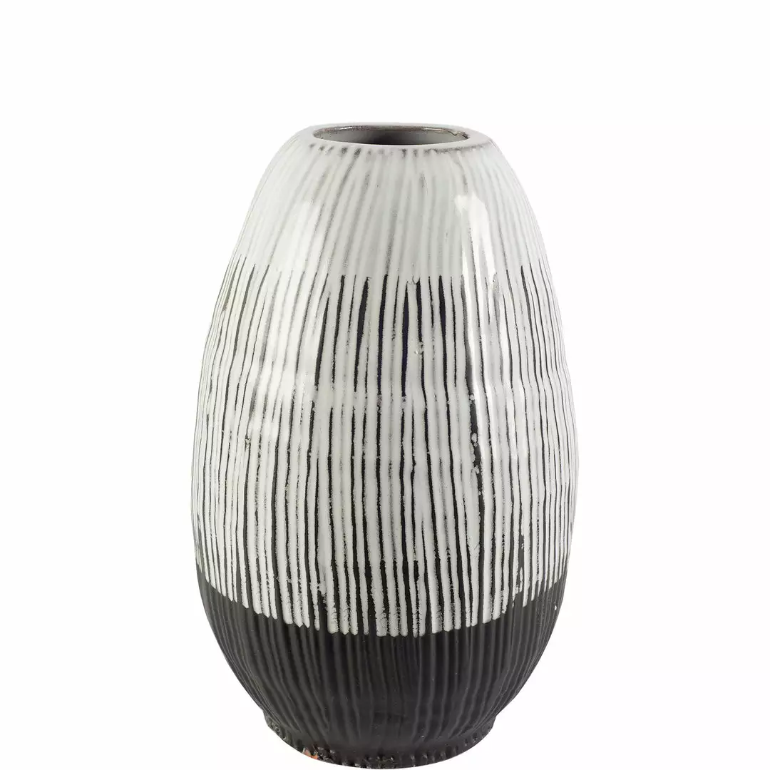 This is a ceramic vase that features a solid dark brown base with a hand painted white glaze accents that lead to a large opening.