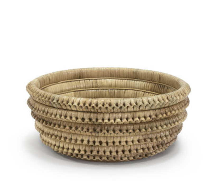 This is made from pole rattan with hand-woven braided rattan peel accented with brown washed abaca matting on inside bottom with hand wrapped handles.