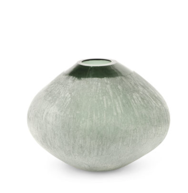 Dark teal green glass vase with hand-etched sides. Each vase is hand-crafted and will vary in color, etching, shape, and thickness. No two pieces will be alike. Vases are watertight.