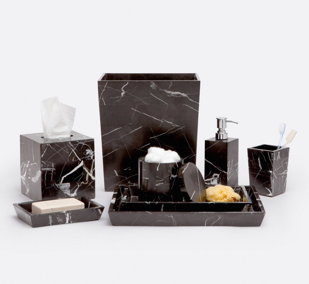 The dark side never looked so good! The bold, black marble of our Luxor collection makes a beautiful statement. The weight and sturdiness of each piece is as impressive as its appearance.