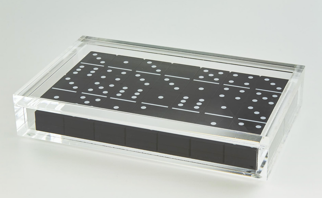A beautiful and stylish domino set in a lucite box.