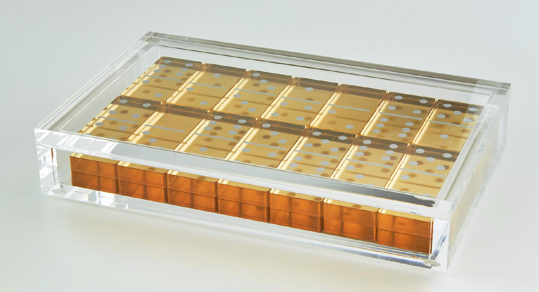A beautiful and stylish domino set in a lucite box.