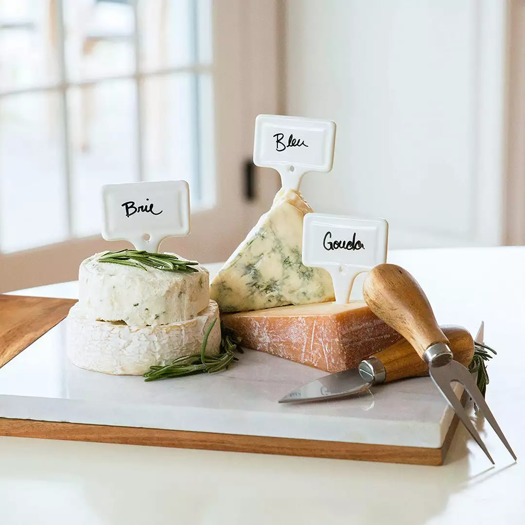 Smooth white ceramic cheese markers are the crowning touch on a beautiful cheese plate. A black food-safe pen comes with the set, letting you identify each wedge or wheel so guests can find and savor their favorites. Bon appetit!