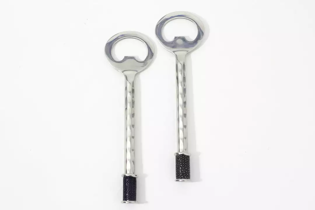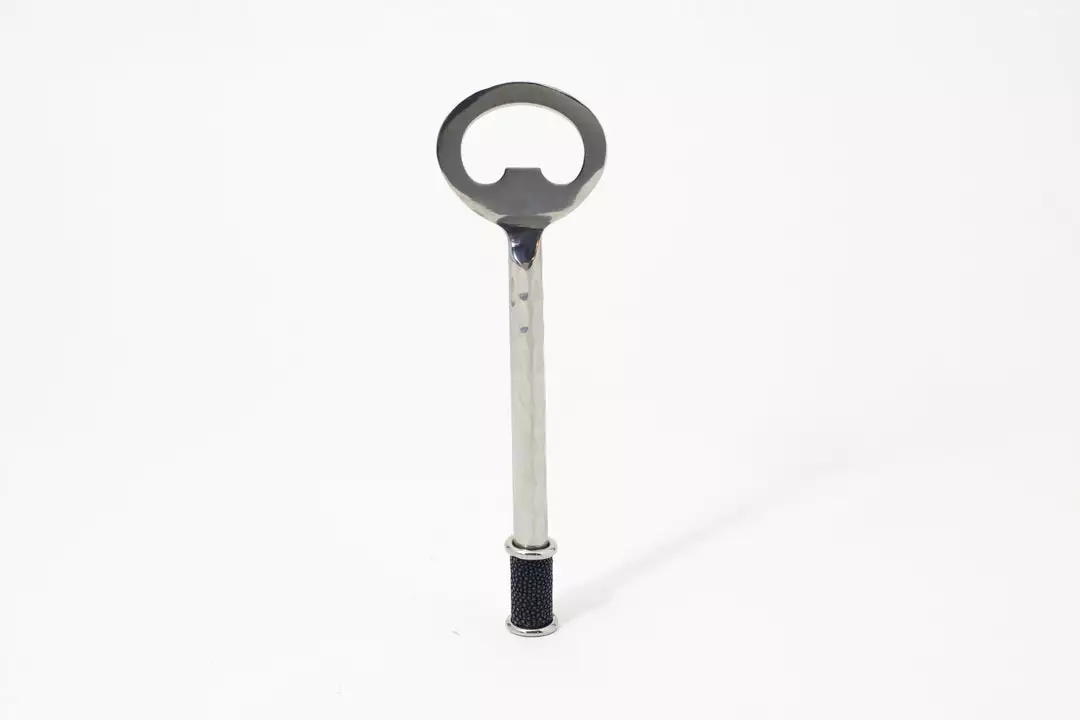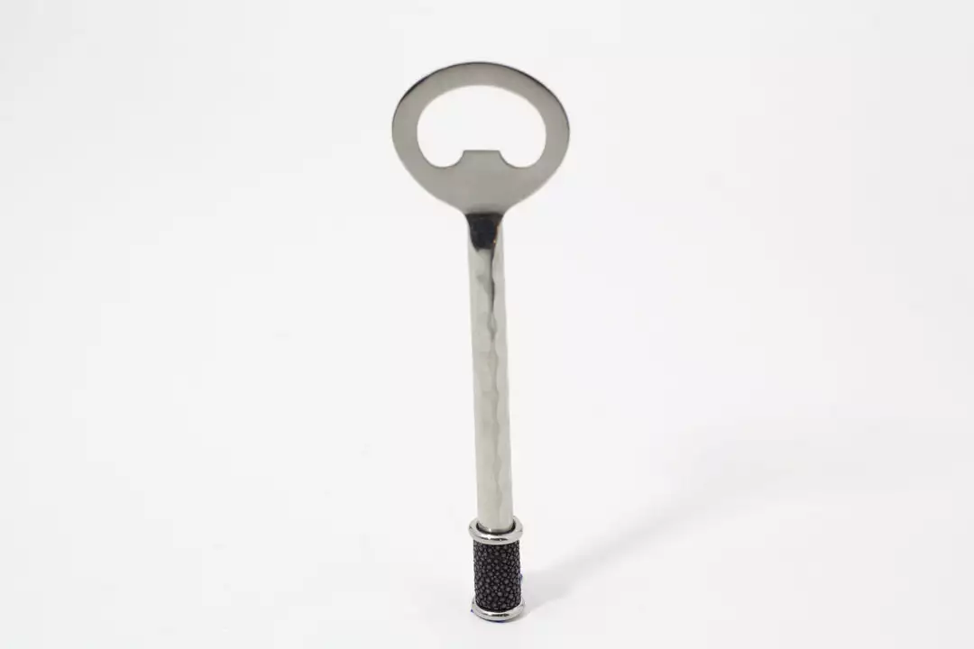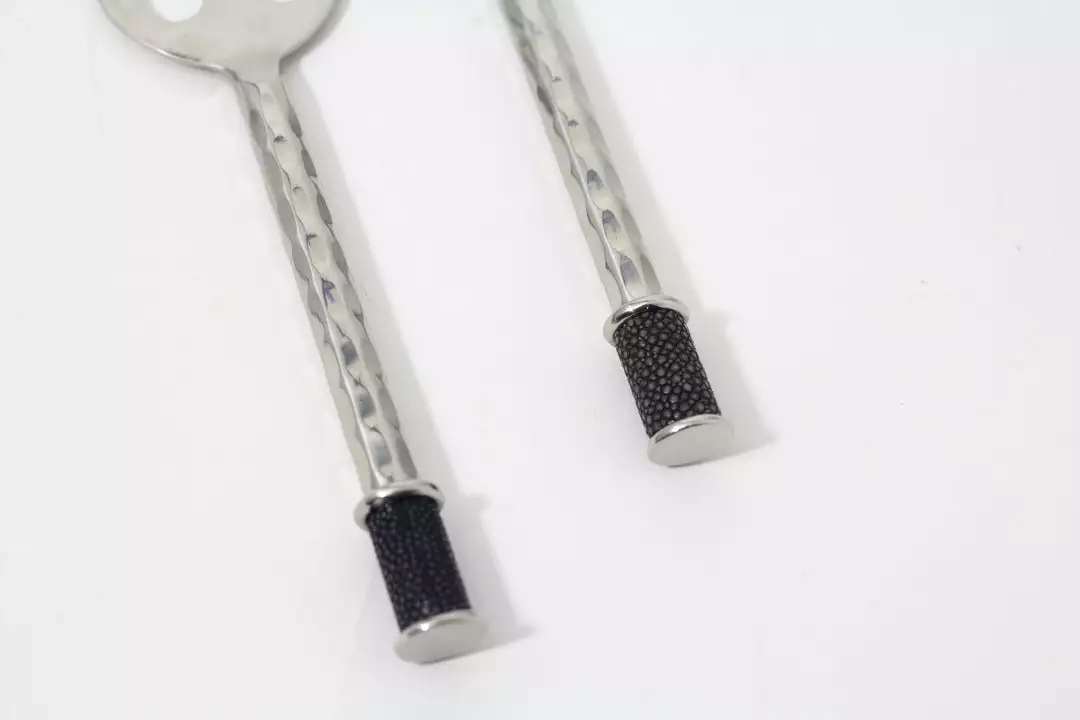 Hand made, hammered stainless steel ice bucket with top & tongs, 6 IN X8 IN . Custom genuine shagreen covered handles.